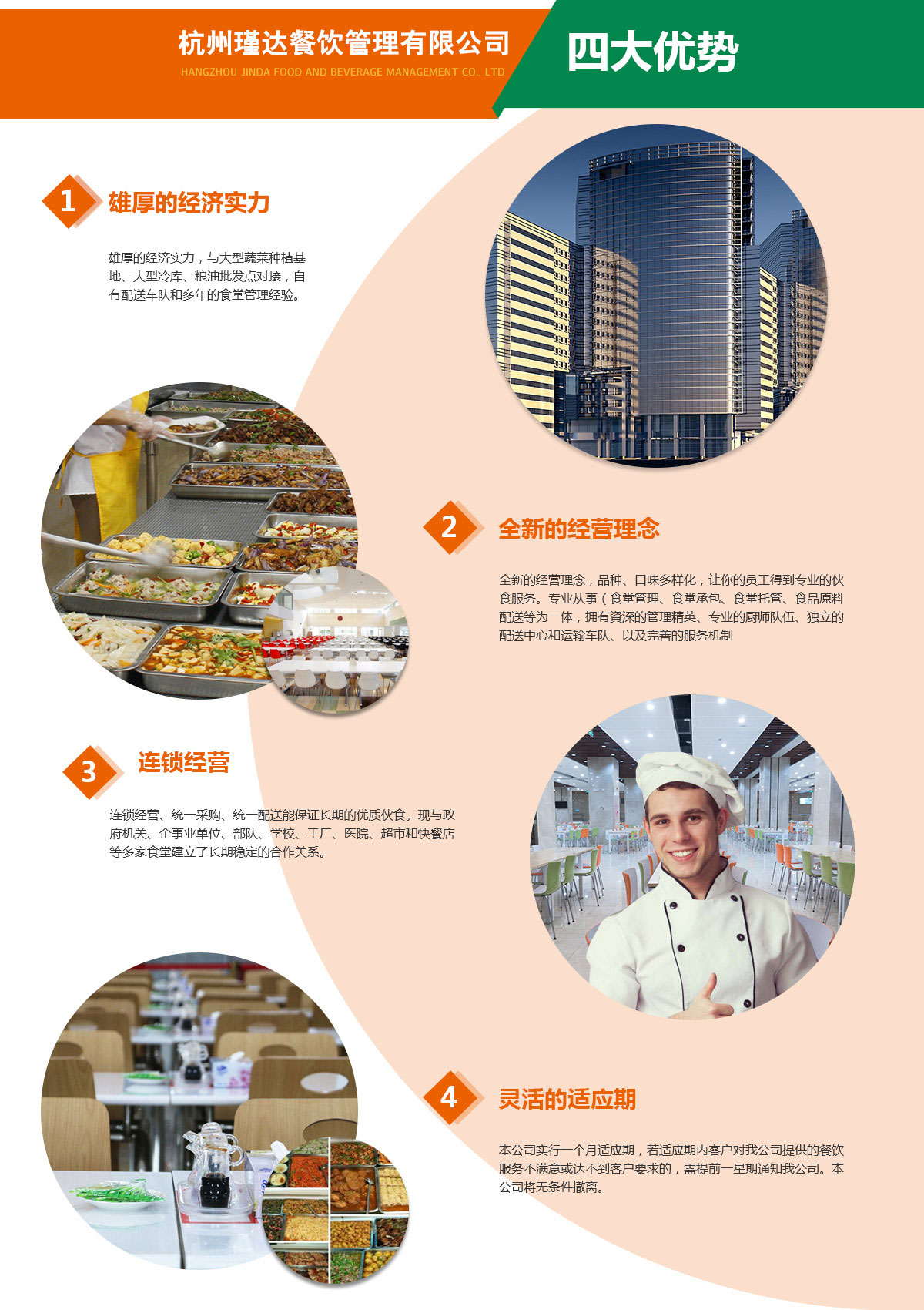 杭州瑾達餐飲管理有限公司隸屬瑾達餐飲集團, 公司本人已有10多年承包大中型食堂,是一家經驗豐富、實力雄厚專業從事企業單位食堂承包、學校食堂托管、營養配送及物流配送、 食堂承包為一體的連鎖經營服務實體,極具發展潛力和競爭能力的杭州食堂承包商。